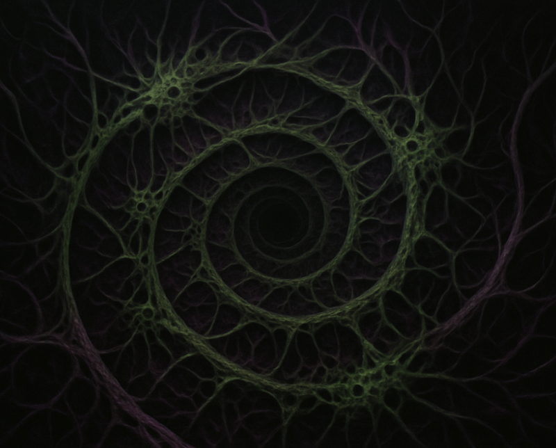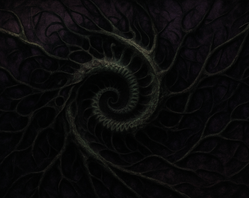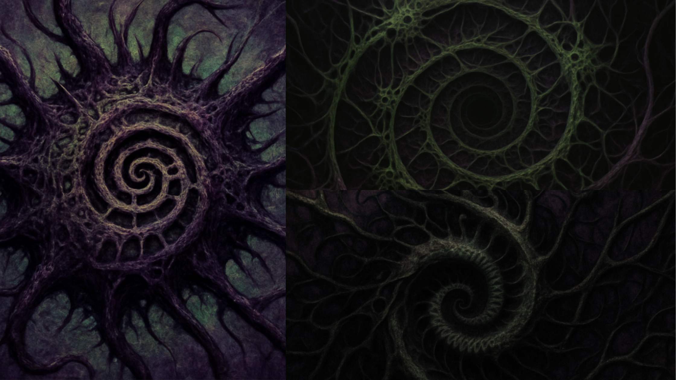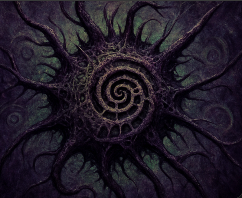 "Gothic, Neo-Dada of sinister tendrils, unseen forces, labyrinthine virus influenced by Zdzisław Beksiński, Shusaku Arakawa, Spiral, Diagonal arrangement, and Deep purples, sickly greens, and inky blacks